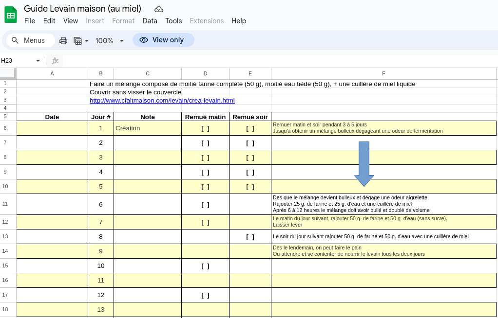 Je vous ai fait un petit Google Doc à imprimer qui vous aidera à vous occuper correctement de votre levain.