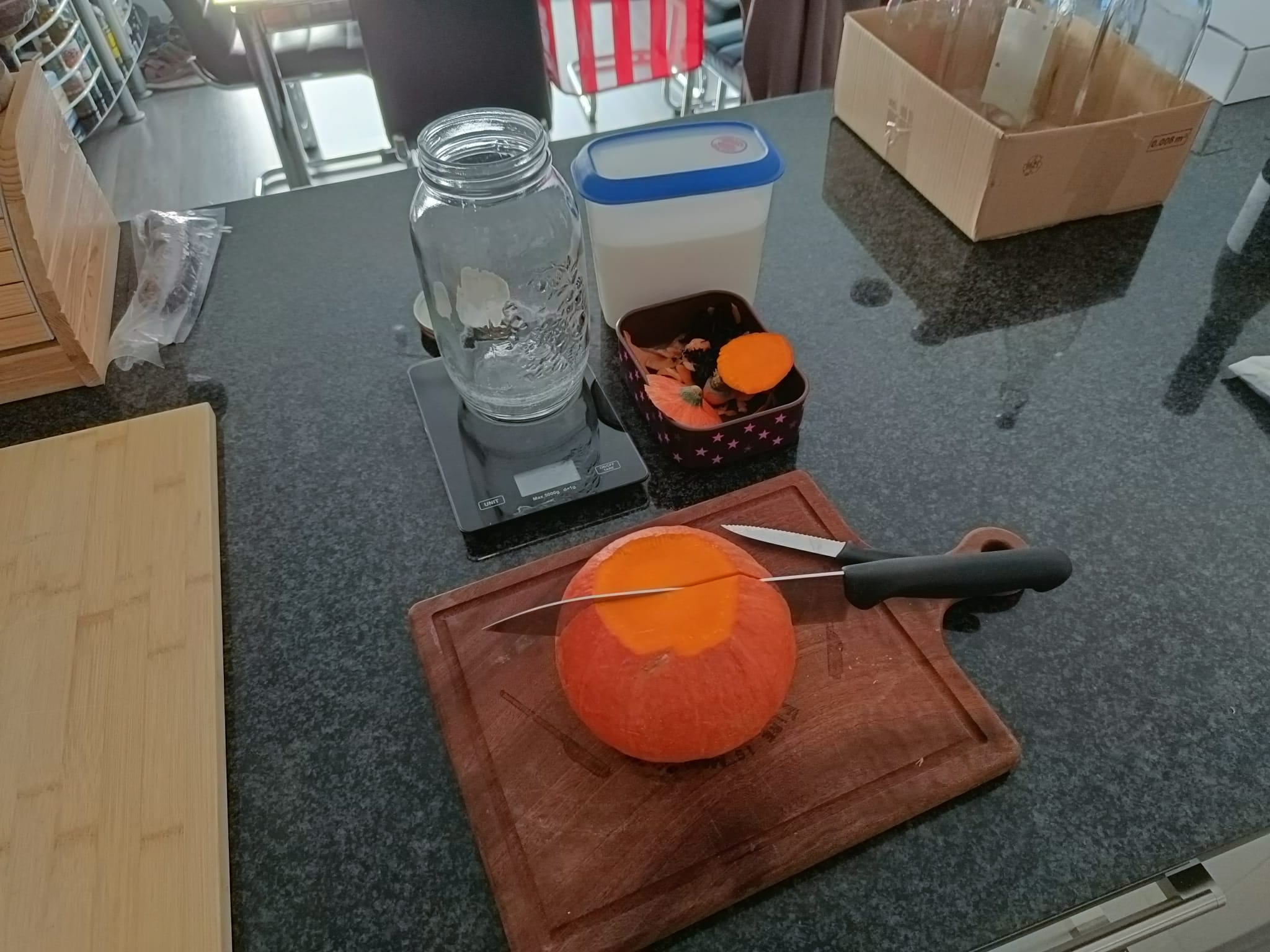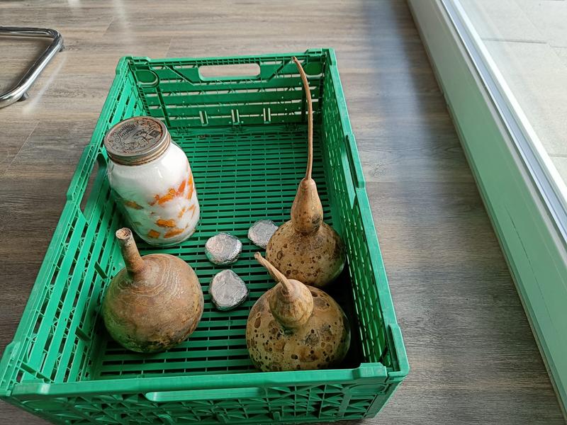 Ici en train de fermenter tranquillement, à côté de mes Courges Calebasses séchées, que je vais prochainement (tenter de...) transformer en ustensiles.